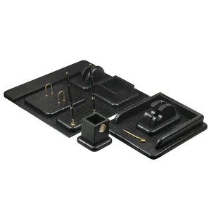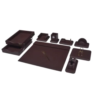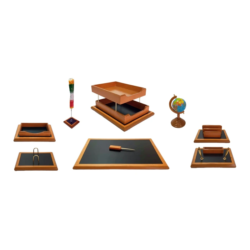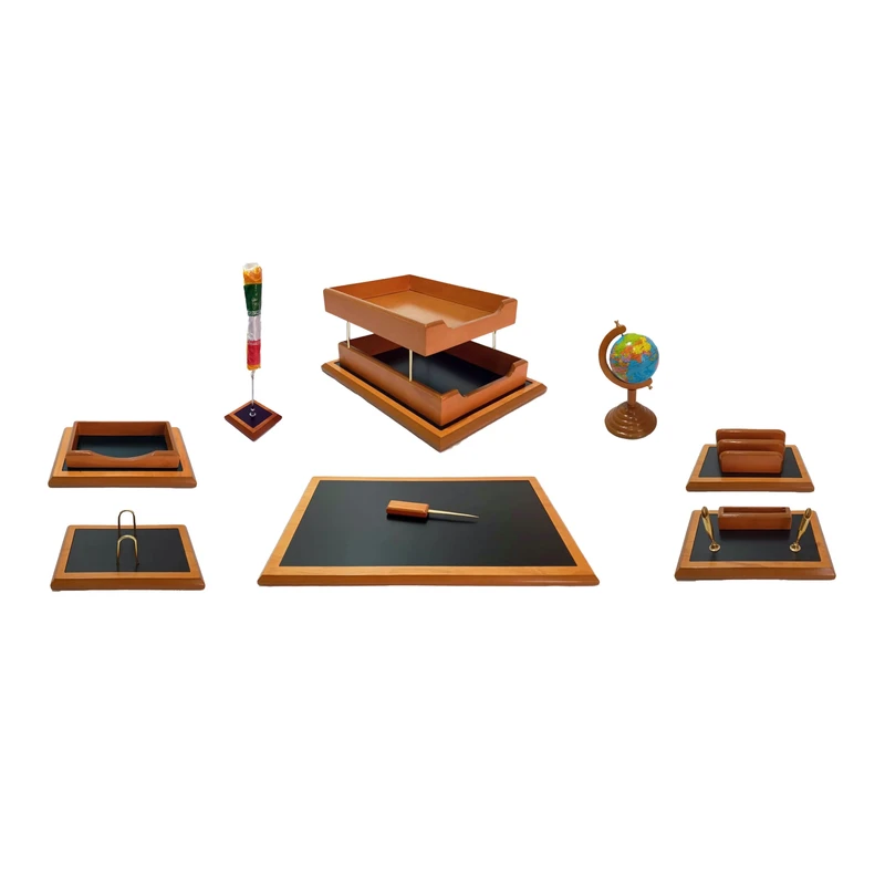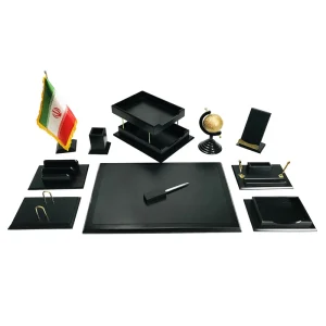 این مجموعه 9 عددی شامل یک زیر دستی بزرگ به ابعاد 60 در 40 (جهت قرار گیری در زیر دست هنگام نوشتار) جامدادی رومیزی ، استند خودکار ، پایه تقویم ، جای کاغذ یادداشت ، کازیه دوطبقه سایز A4 ، نگهدارنده نامه ، پرچم جمهوری اسلامی ایران (به همراه پایه) ، یک کره زمین تزیینی و یک چاقوی نامه باز کن است که همگی آنها از جنس چوب طبیعی به همراه روکش رنگ مرغوب ساخته شده اند و برای داشتن یک میز کار منظم بسیار کاربردی میباشد.