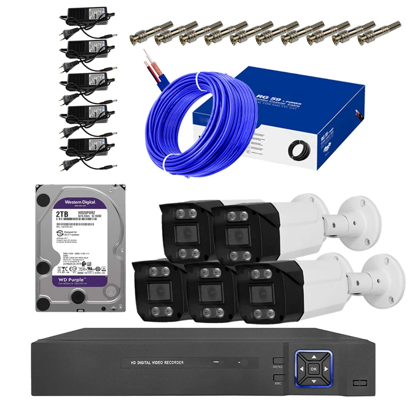 پکیج کامل امنیتی AHD شامل پنج دوربین مداربسته وارملایت AHD دو مگاپیکسلی (ضد آب و دارای دید در شب رنگی)بدنه فلزی مناسب محیطهای داخلی و فضای بیرون(فروشگاهها،منازل مسکونی و شرکتهاو…) بدون محدودیت برای نصب، یک عدد دستگاه ضبط DVR هشت کانال و هارد دوترابایت وسترن دیجیتال بنفش و پنج عدد آداپتور 2آمپر و 25 متر کابل ترکیبی مغزی 0.7 مس (شامل کابل برق+RG) و 10عدد فیش BNC میباشد.