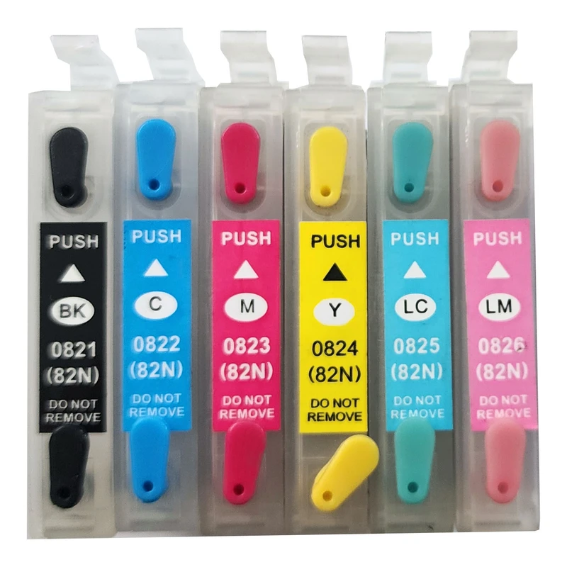 پک کامل 6 عددی جوهر مخزن اپسون قابل شارژ مدل T82N از T0821 الی T0826 , مخازن خالی از جوهر میباشند . مناسب برای R390, R270, R290, R295, RX590, RX615, RX610, RX690 با خرید کارتریج قابل شارژ به علت وجود چیپ اتوریست دیگر احتیاج به تعویض کارتریج نخواهید داشت .